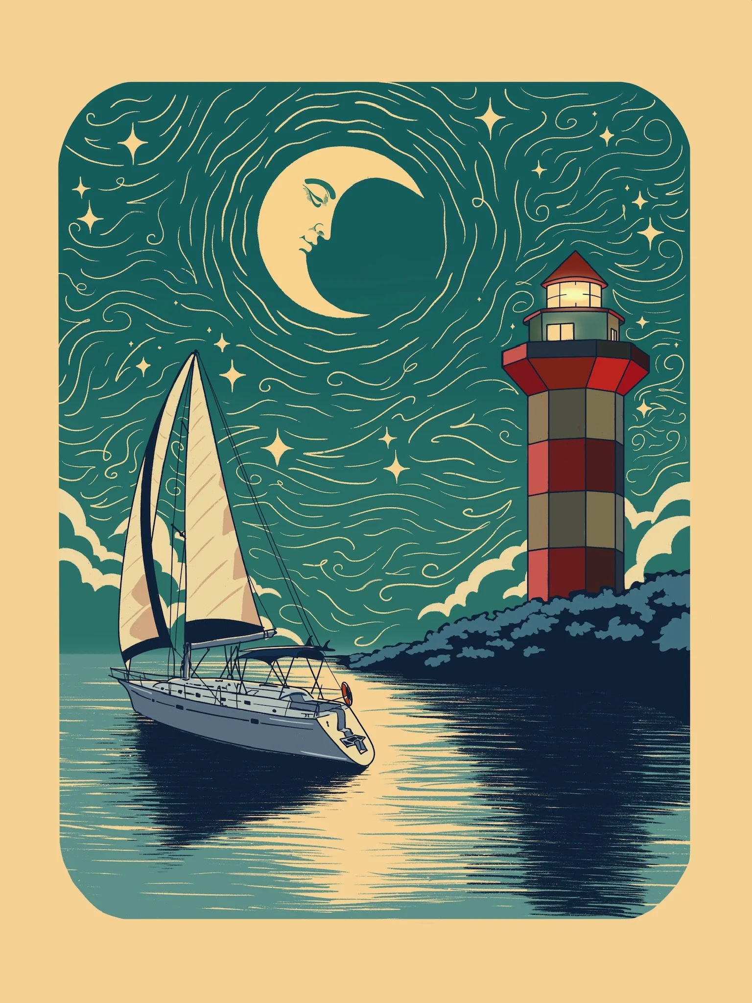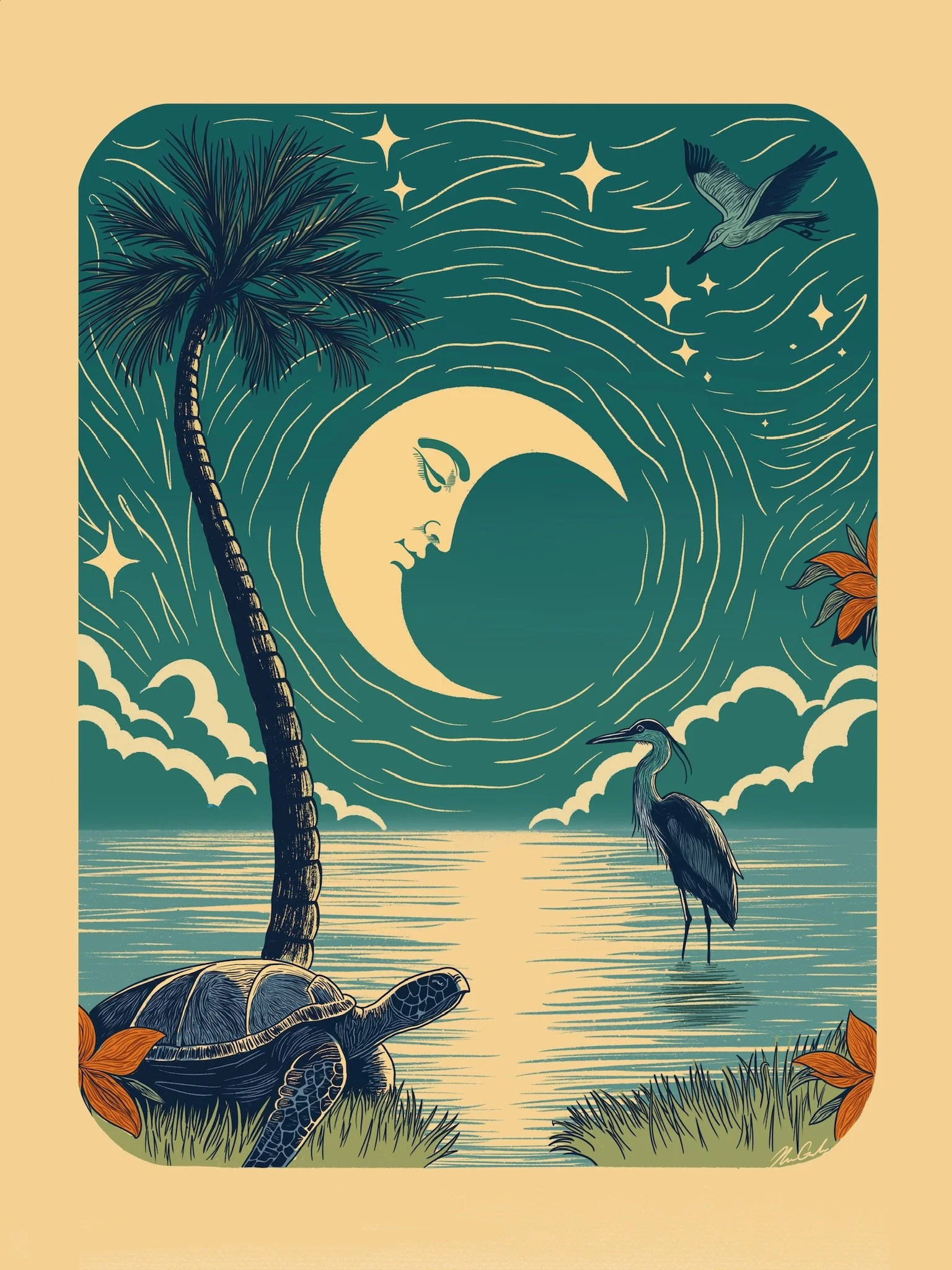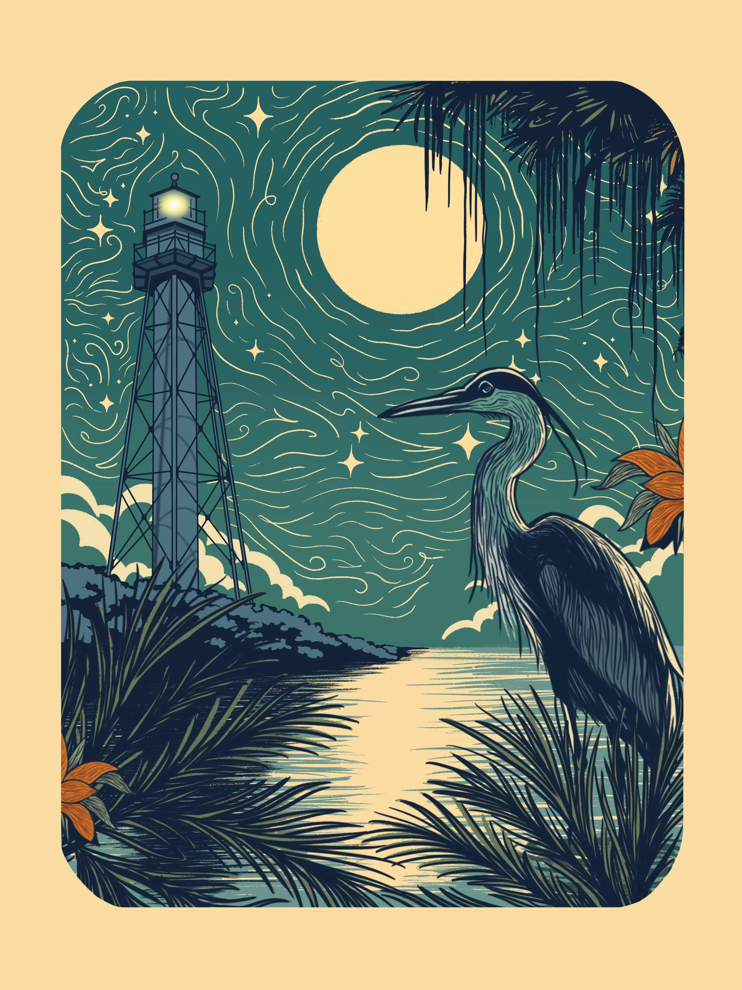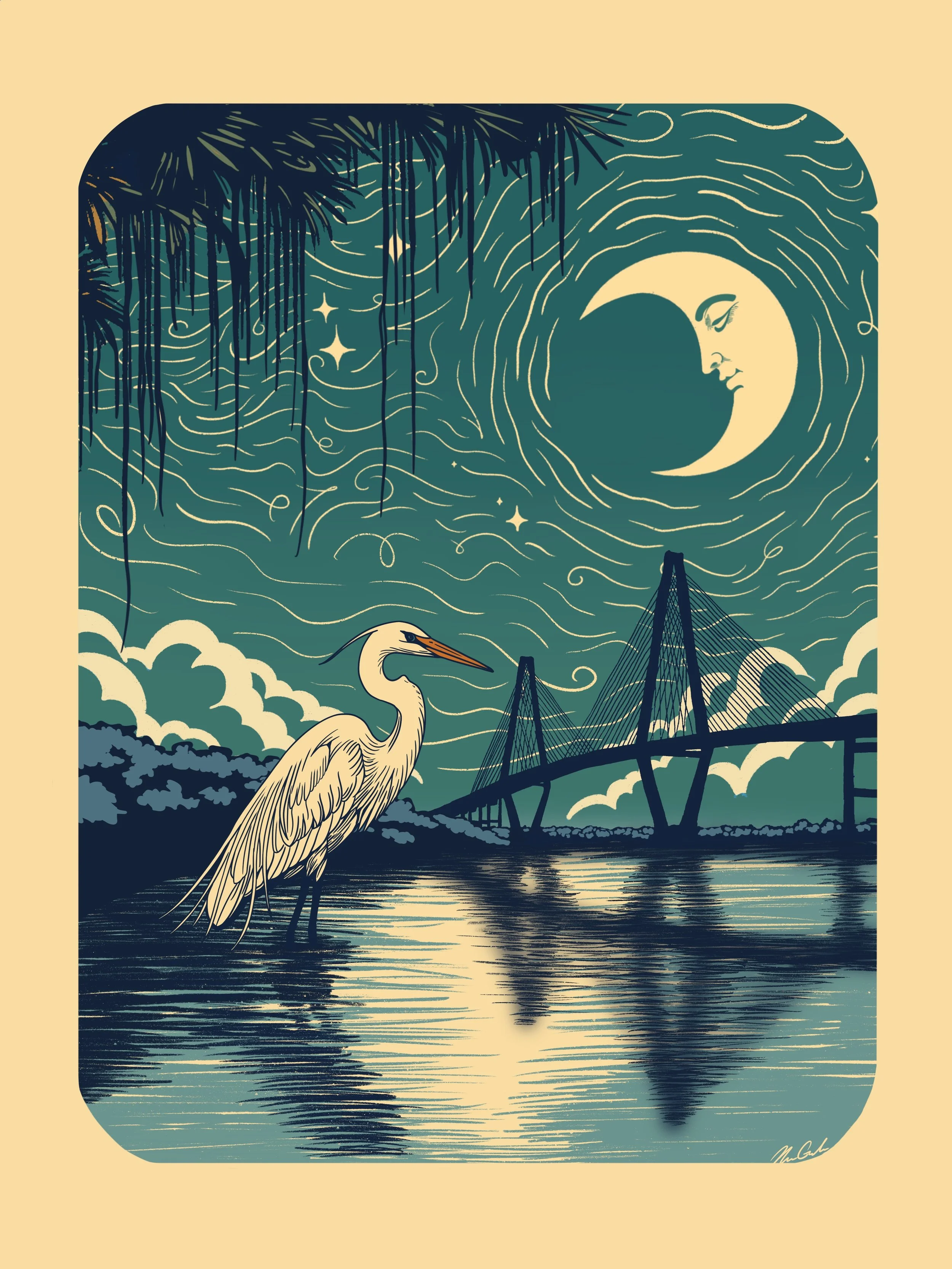 Drawing inspirations artists like Van Gogh, as well as techniques from woodblock printing, I took those and translated them into the digital world. I chose rich colors to create a contrast in the night. The wind blowing from the starry nights. The since of peace watching the night come alive. I want to show off the beauty and mysterious energy that this low country provides.